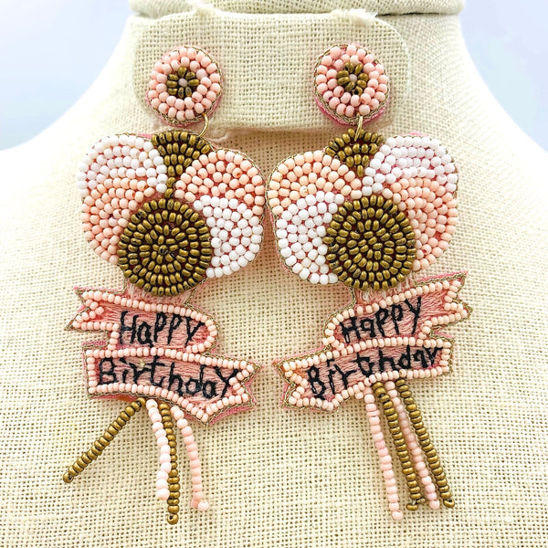 Beaded Happy Birthday Balloons Earrings in Black or Pink (1.5x3.5in)
