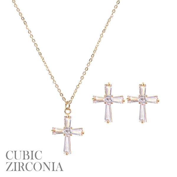 Cubic Zirconia Baguette Cross Earring & Necklace Set in Silver or Rose Gold