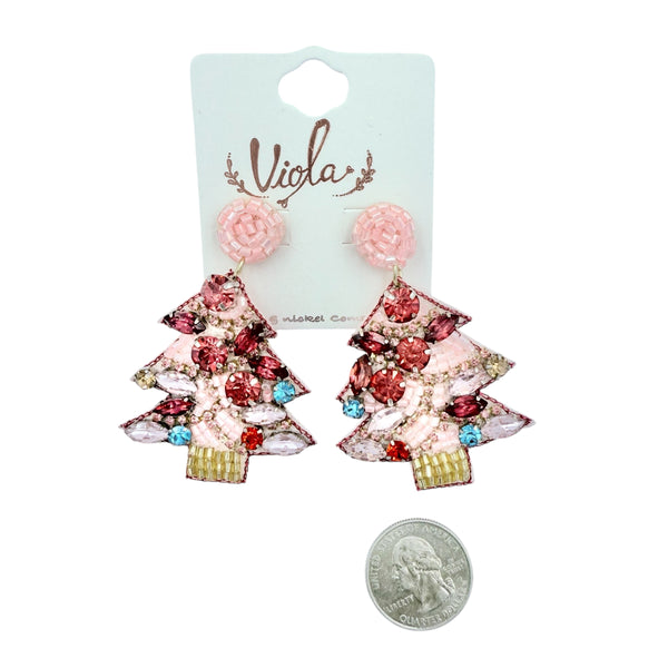 Pink Christmas Tree Beaded Earrings (2x2.5in)