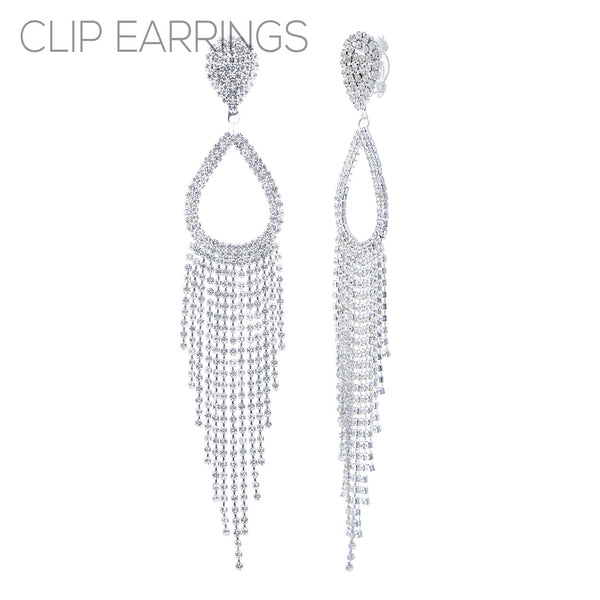 Rhinestone Teardrop Fringe Clip On Earrings in Silver or Gold (1.08x5.75in)